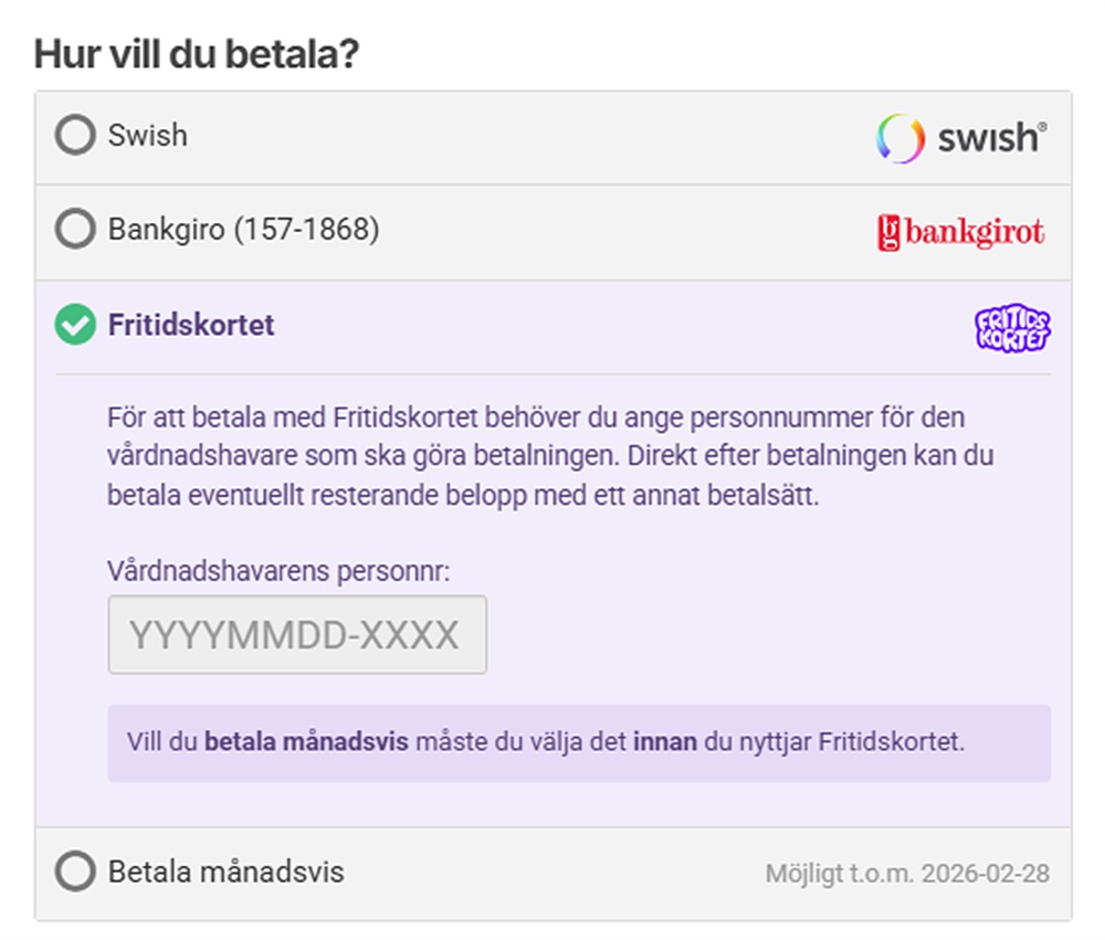 Fritidskortet kan användas som betalsätt vid betalning av fakturan. Det går bra att betala hela avgiften med Fritidskortet eller...